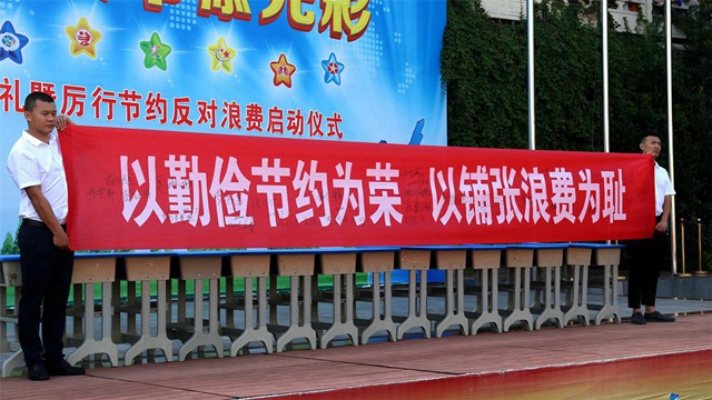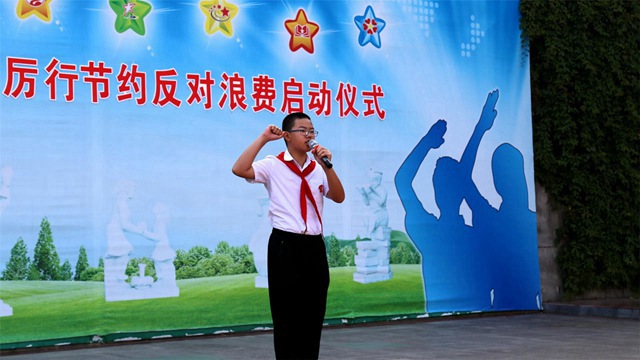 “自覺(jué)節(jié)約一粒米、一滴水、一張紙、一度電……做中華傳統(tǒng)美德的傳承者?!眱x式上,該校大隊(duì)部老師宣讀了倡議書(shū),號(hào)召同學(xué)們杜絕浪費(fèi),珍惜勞動(dòng)成果;自覺(jué)做到合理飲食,踐行“光盤(pán)行動(dòng)”,拒絕“舌尖上的浪費(fèi)”;做到簡(jiǎn)樸儉約,弘揚(yáng)傳統(tǒng)美德;提倡低碳生活,倡導(dǎo)文明新風(fēng);堅(jiān)持綠色出行、做好垃圾分類(lèi),抵制搞攀比、講排場(chǎng),做簡(jiǎn)約生活方式的踐行者。