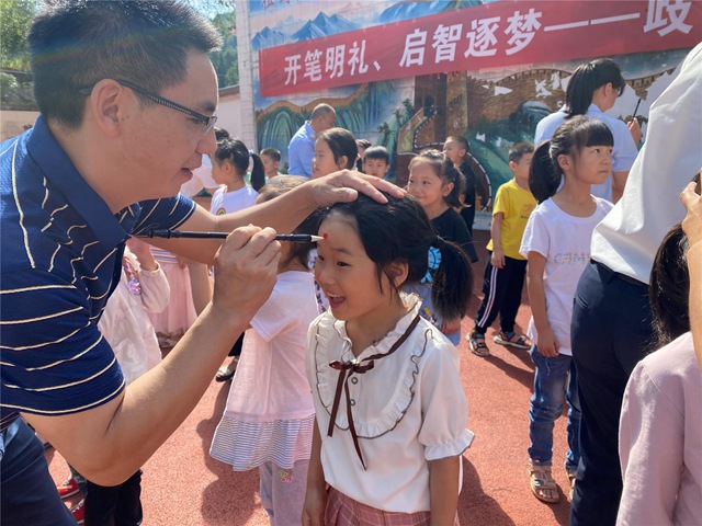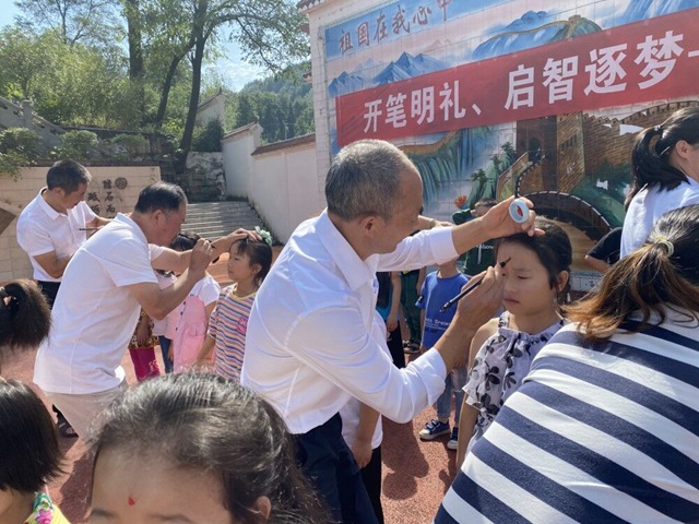在大會熱烈的氣氛中,一年級新生們迎來了莊嚴(yán)的拜師禮儀式。全體學(xué)生面對自己的老師行三鞠躬禮,表達了他們對老師們的無上的敬意和無限的熱愛。接著老師們?yōu)楹⒆觽儭爸焐皢⒅?”,在孩子們額頭正中點上朱砂,即為“聰明記”,又稱“開天眼”,從此成為眼明、心明、好讀書、讀好書的聰明學(xué)童。