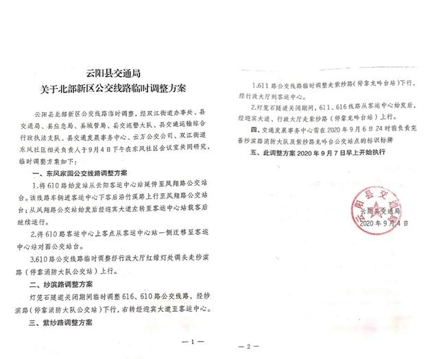 1、將610路始發(fā)站從云陽客運中心站延伸至鳳翔路公交站臺。該線路車輛進客運中心下客后沿竹溪路上行至鳳翔路公交站臺;從鳳翔路公交站始發(fā)后經(jīng)迎賓大道左轉至客運中心站載客后繼續(xù)運行。
