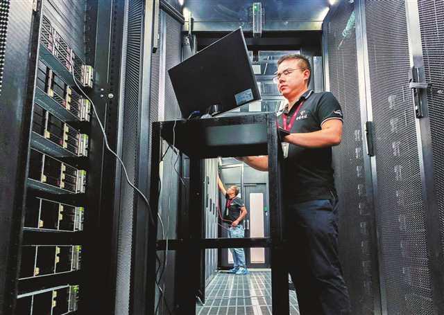 圖⑥:在位于兩江新區(qū)水土園區(qū)的中國電信兩江騰龍數據中心(二期),工作人員正在調試維護設備。