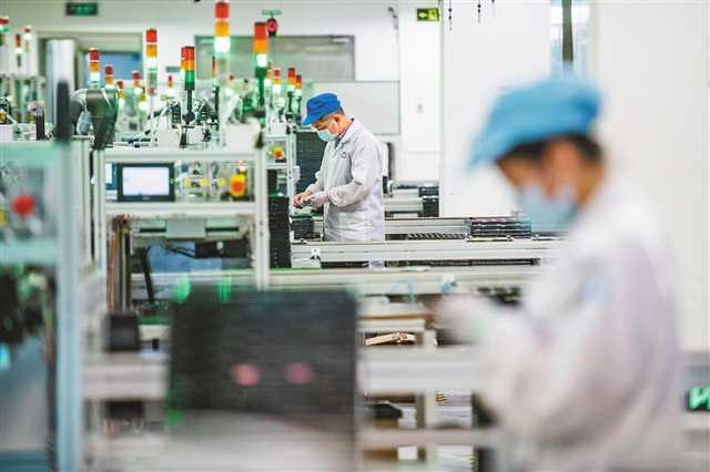 圖①:西永微電子產業(yè)園廣達(重慶)電腦有限公司生產車間,工人正在生產線上作業(yè)。