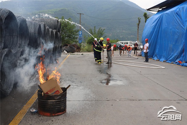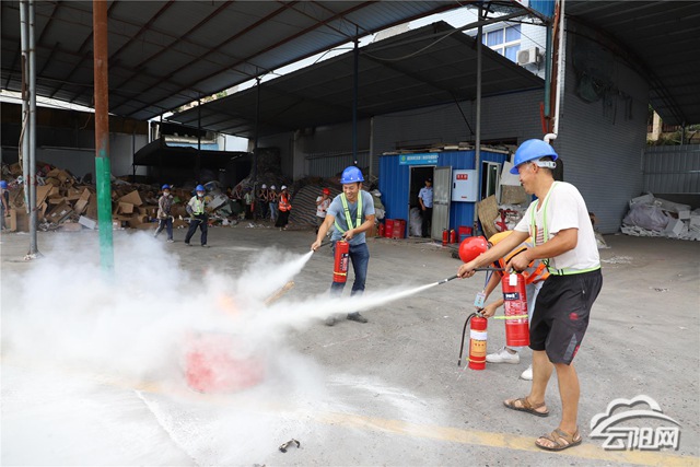 演練模擬云陽港務(wù)站下巖寺碼頭內(nèi)零散紙殼失火,火勢蔓延,引燃其他已經(jīng)打包成件的廢紙殼。倉庫員工發(fā)現(xiàn)火情后大聲呼救,就近取用滅火器滅火,同時向值班負責(zé)人和長航公安報告,緊急疏散員工。廢紙殼燃燒速度極快,明火蔓延迅速,緊急趕到的民警和企業(yè)員工打開消防栓,合力將火撲滅。