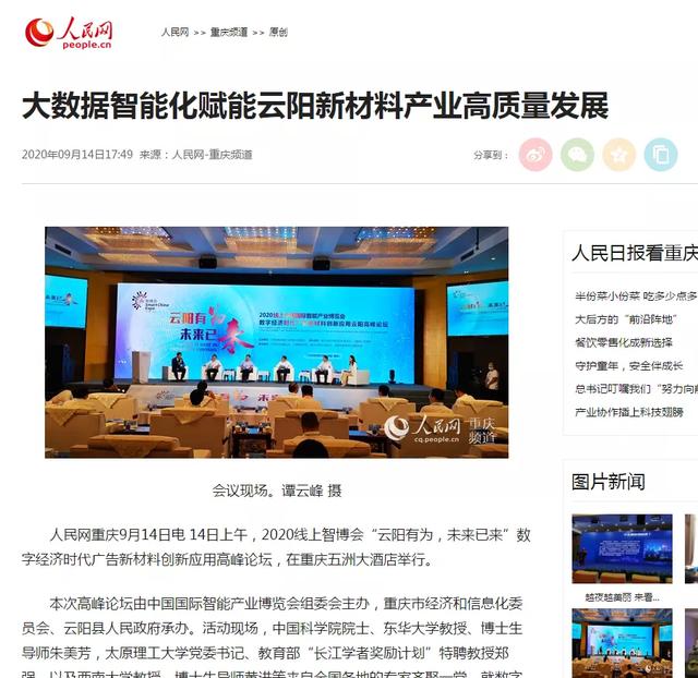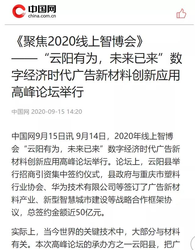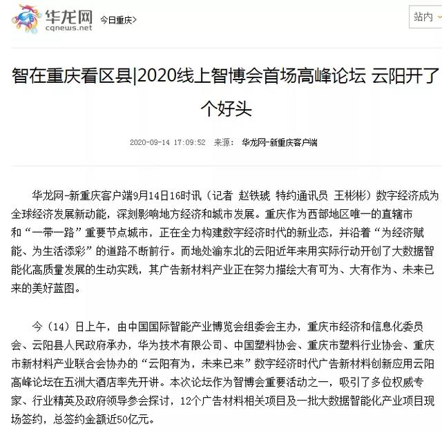 9月14日,2020線上中國國際智能產業(yè)博覽會——“云陽有為,未來已來”數字經濟時代廣告新材料創(chuàng)新應用云陽高峰論壇在重慶舉行。
