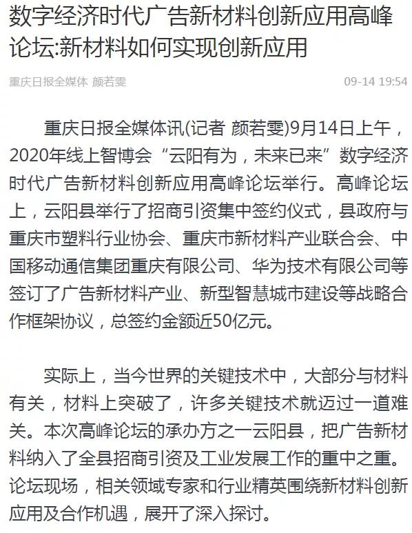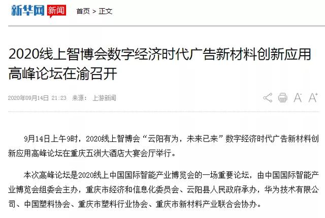 《聚焦2020線上智博會》——“云陽有為,未來已來”數字經濟時代廣告新材料創(chuàng)新應用高峰論壇舉行