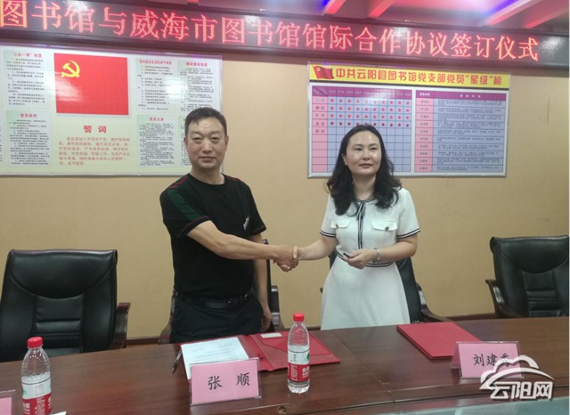 在交流期間,威海市圖書館劉建秀副書記帶領(lǐng)團(tuán)隊(duì)分別介紹了威海市圖書館的基本情況和各項(xiàng)業(yè)務(wù)工作開展情況,并重點(diǎn)介紹了威海市圖書館特色黨建品牌“精致黨課 常學(xué)常新”活動(dòng)。隨后,云陽縣圖書館和威海市圖書館簽訂了館際合作協(xié)議書。