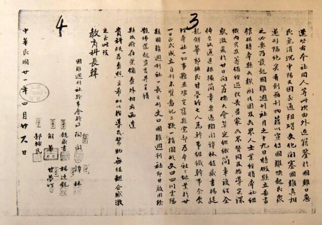 1932年4月26日,陶訚、譚林等人向縣教育科呈報申請出版《國難周刊》