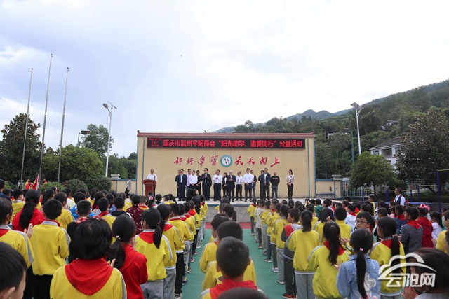 重慶溫州平陽(yáng)商會(huì)會(huì)長(zhǎng)黃克鎖在捐贈(zèng)儀式上諄諄教導(dǎo)全體學(xué)生好好讀書,少年強(qiáng)則國(guó)強(qiáng),努力奮斗,爭(zhēng)做有益于國(guó)家,有益于社會(huì)的新青年。