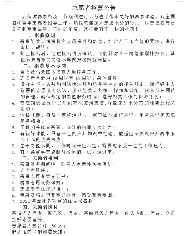 云陽網(wǎng)訊(記者 何競嘉)近日,記者從縣文旅委獲悉,隨著2020“萬里長江·天生云陽”戶外多項運動挑戰(zhàn)賽開賽日期的日益臨近,各項準(zhǔn)備工作也在緊鑼密鼓的展開。賽事組委會現(xiàn)向社會招募150名賽事志愿者。