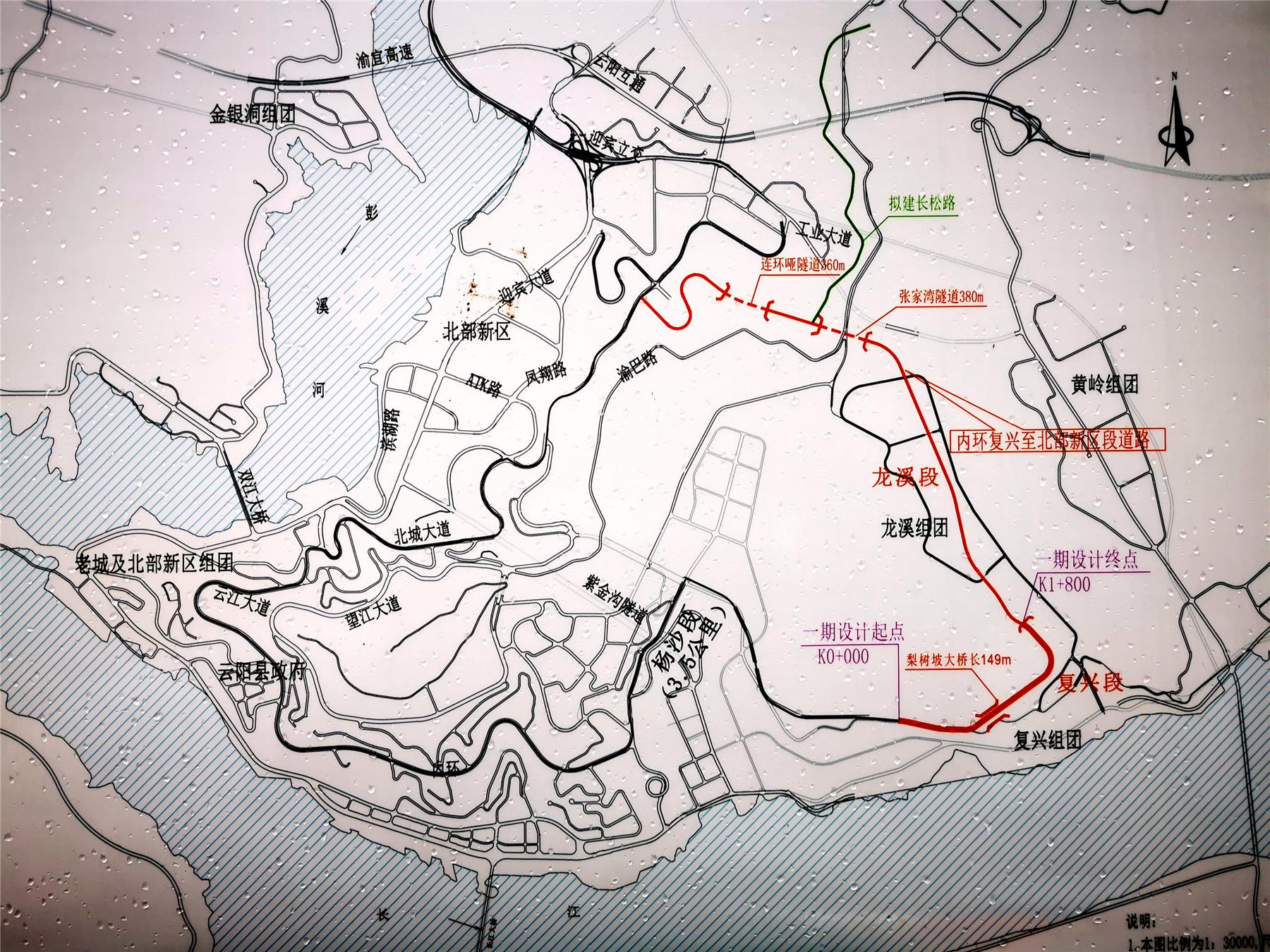內(nèi)環(huán)復(fù)興至北部新區(qū)段道路南起復(fù)興社區(qū),向北延伸,經(jīng)龍脊山脈,與北部新區(qū)創(chuàng)業(yè)大道相接,全長約6.9千米。道路等級為城市主干路,標(biāo)準(zhǔn)路幅寬度為24米,設(shè)計車行速度為每小時40千米,雙向4車道。全段設(shè)橋梁1座——梨樹坡大橋,全長149米;設(shè)隧道2座,分別是張家灣隧道,全長380米,連環(huán)埡隧道,全長360米。