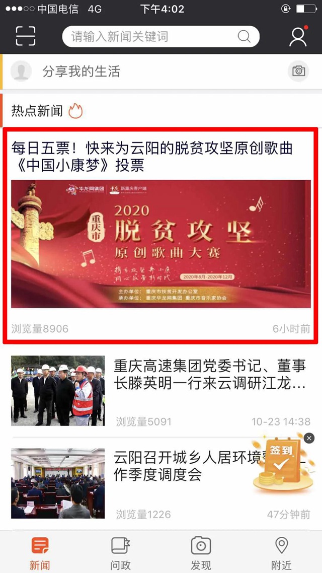 方法一:進(jìn)入“智慧云陽”APP,點(diǎn)擊首頁“2020重慶市脫貧攻堅原創(chuàng)歌曲大賽投票活動”新聞,進(jìn)入投票通道。
