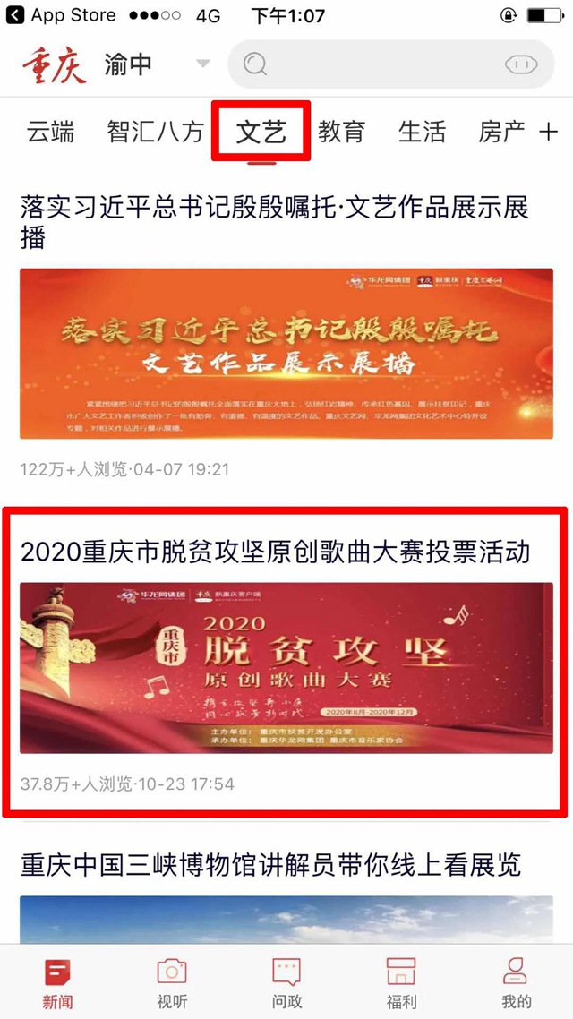 方法二:下載“新重慶”app,注冊并登錄。進(jìn)入“文藝”欄目,找到“2020重慶市脫貧攻堅原創(chuàng)歌曲大賽投票活動”(或直接在“新重慶”app搜索欄搜索)。