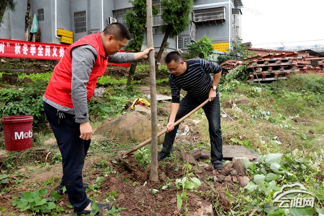 記者在盤龍街道盤石社區(qū)濱江蘭庭小區(qū)看到,街道的干部職工、社區(qū)群眾和志愿者分工協(xié)作,有的揮鋤填坑,有的固苗踩土,有的提水灌溉……現(xiàn)場一片熱火朝天景象。