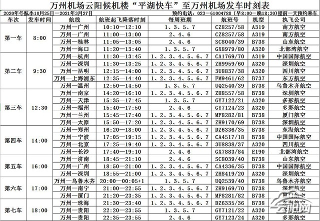 “我們根據(jù)機(jī)場的航班表,研究機(jī)場的出港和到港的航班情況,然后制定班車的時(shí)刻表,盡量照顧到大部分旅客,及時(shí)將旅客送到萬州機(jī)場乘坐相關(guān)航班?!比f州機(jī)場相關(guān)負(fù)責(zé)人表示,旅客可提前一天撥打電話023—61004788預(yù)約乘車。