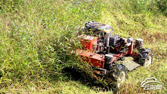 一輛遙控割草機在工作人員的操作下,靈活地穿梭在果園林間,林中的雜草一片片被放倒。這款割草機是專門針對果園開發(fā)的除草農(nóng)機新型產(chǎn)品,每小時能完成割草2600余平方米。