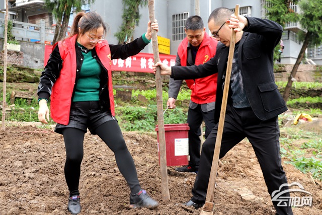 記者在盤龍街道盤石社區(qū)濱江蘭庭小區(qū)看到,街道的干部職工、社區(qū)群眾和志愿者分工協(xié)作,有的揮鋤填坑,有的固苗踩土,有的提水灌溉……現(xiàn)場一片熱火朝天景象。