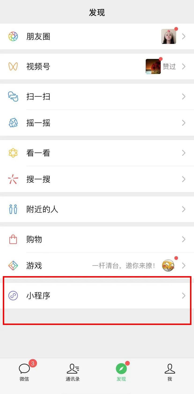 第一步:打開(kāi)微信。點(diǎn)擊底部“發(fā)現(xiàn)”,進(jìn)入“小程序”