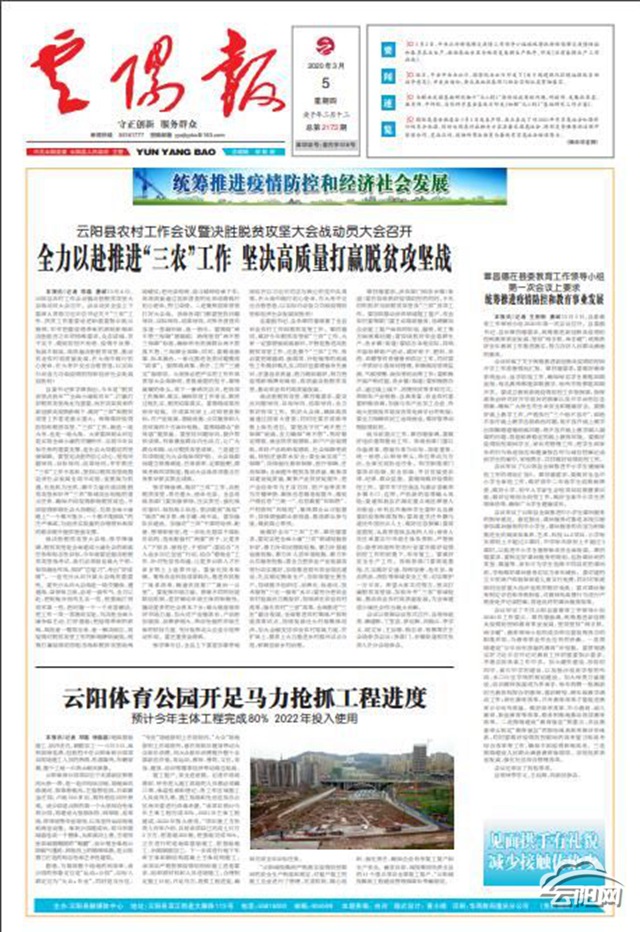 2020年以來,縣融媒體中心以習近平新時代中國特色社會主義思想為引領,圍繞中心、服務大局,堅持守正創(chuàng)新,突出凝心聚力,履行使命任務,推進媒體融合,打造特色品牌,以實際行動為全縣經(jīng)濟社會發(fā)展營造良好的輿論氛圍。在“戰(zhàn)疫”“戰(zhàn)貧”“重點項目建設”等主題宣傳中,《云陽報》推出了“講好抗疫故事,弘揚抗疫精神”“脫貧攻堅進行時”“聚焦重點項目建設”“城市提升在行動”“推動千億工業(yè)高質(zhì)量發(fā)展”“傳達學習貫徹黨的十九屆五中全會精神”等系列報道和專欄,推出了一批有深度、有溫度、有影響的作品?!对脐枅蟆肪o緊圍繞中心工作,提升報紙質(zhì)量。通過版面創(chuàng)新、專欄設置、重視策劃、內(nèi)容改革等舉措,報紙質(zhì)量上了一個新臺階,提高了報紙的可讀性和讀者的認可度。