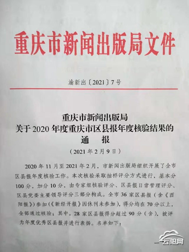 云陽網(wǎng)訊(記者 譚啟云)近日,2020年度重慶市區(qū)縣報年度核驗結(jié)果出爐?!皟?yōu)秀區(qū)縣報”中,《云陽報》榜上有名。