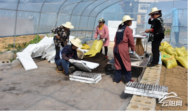 圖為正在新建的溫室大棚里翻土、播種、擺盤