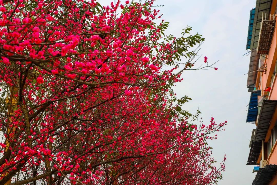 紅梅那一抹紅點亮了月光草坪的春天