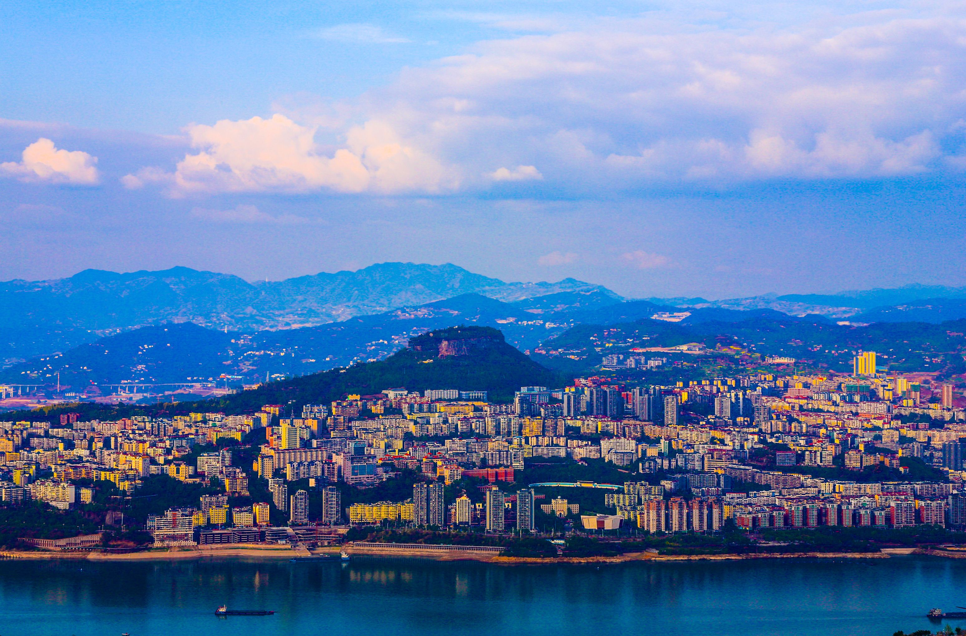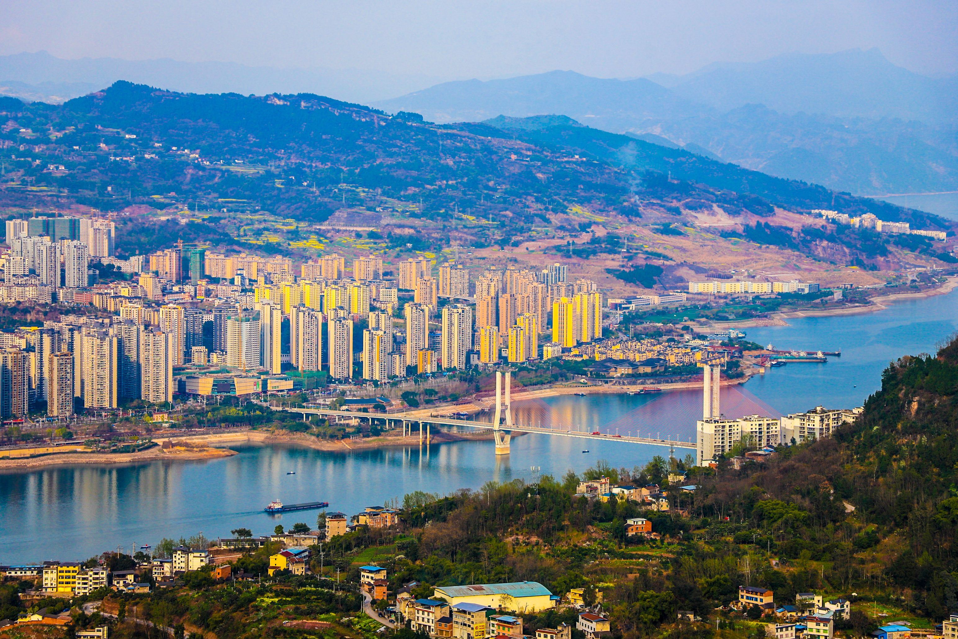 在盤龍街道陽明村觀景臺(tái)俯瞰云陽全貌,以磐石城為起點(diǎn),連綿不絕的長江水向四周蔓延,形成四角,宛如一只飛燕銜新泥。(譚啟云 攝)