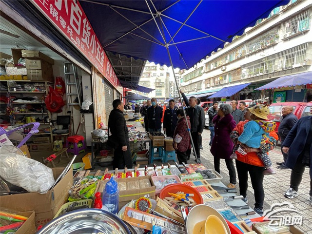在蓮花市場(chǎng),執(zhí)法人員對(duì)占道經(jīng)營(yíng)、車輛亂停亂放、無(wú)證經(jīng)營(yíng)、自設(shè)遮(陽(yáng))雨帽存在消防安全隱患、環(huán)境衛(wèi)生問(wèn)題等情況進(jìn)行排查。