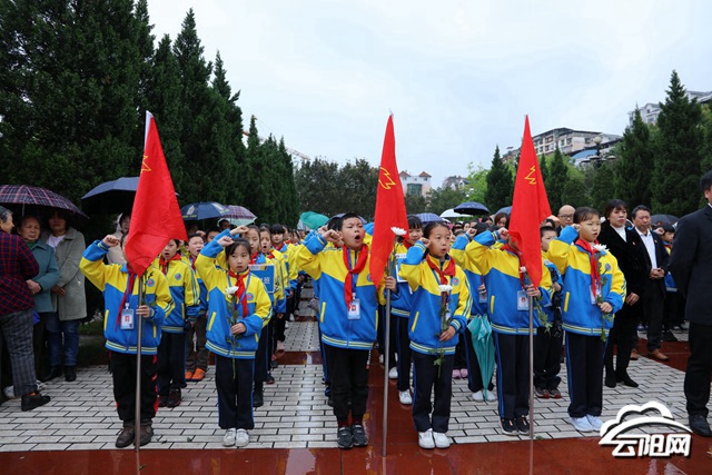 少先隊員代表講述革命英雄故事《銘記紅巖魂》,接著全體人員向革命烈士鞠躬默哀,獻花籃、瞻仰紀念碑、寄托心中的哀思,最后,全體師生齊唱《沒有共產(chǎn)黨就沒有新中國》,整個活動井然有序、莊嚴肅穆。