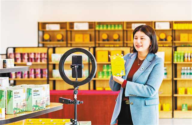 楊雪梅為菊花產(chǎn)品直播帶貨。(萬靈鎮(zhèn)供圖)