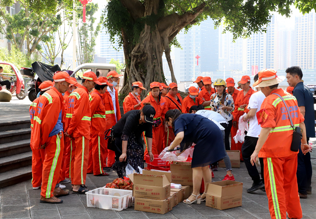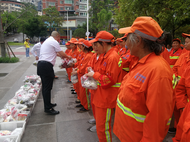 云陽網(wǎng)訊(實習(xí)生 黃美琪 實習(xí)生 吳孟軒)6月11日,縣城管局、徐工集團聯(lián)合愛心企業(yè)綠康食品為城區(qū)的環(huán)衛(wèi)工人送上了粽子、節(jié)日慰問品等愛心物資,讓在烈日下辛勤工作的“城市美容師”吃上了新鮮的粽子,并送上了節(jié)日的祝福和問候。參加活動的有縣城管局副局長羅倫、徐工集團領(lǐng)導(dǎo)丁鴻飛、城管局環(huán)衛(wèi)所負(fù)責(zé)人及所有環(huán)衛(wèi)工人等共計700余人。