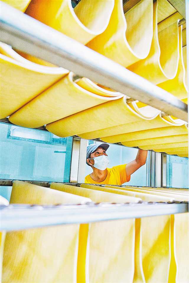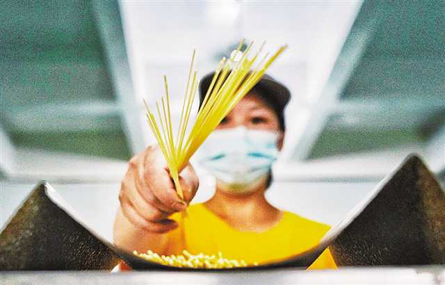 6月9日,云陽(yáng)縣人和工業(yè)園區(qū),陳大毛面業(yè)生產(chǎn)車間,陳莉正在面條烘房的運(yùn)輸線上抽檢。記者 崔力 攝/視覺(jué)重慶