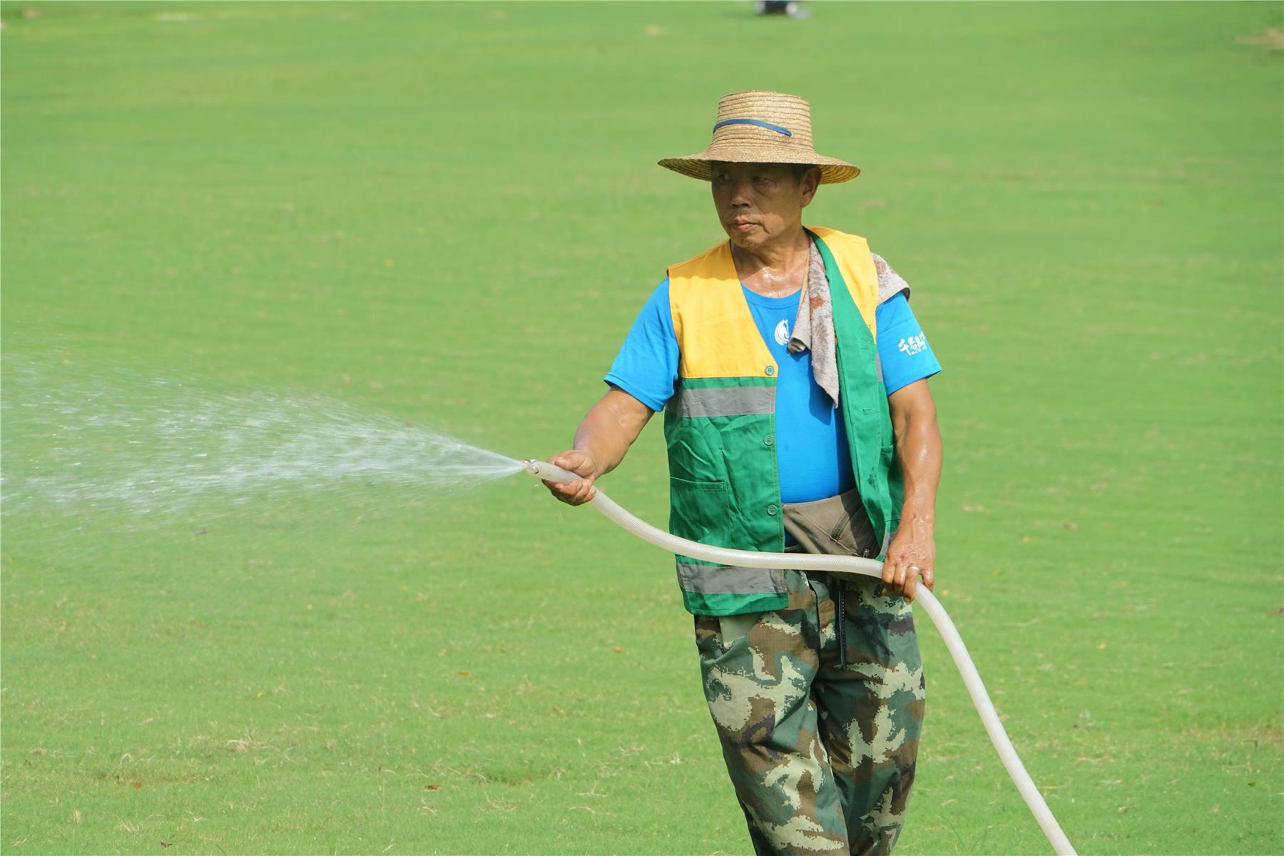 7月20日下午3點,在亮得晃眼的烈日下,月光草坪附近一臺除草設(shè)備“隆隆”作響,近50歲的王成剛熟練地拿著工具,不停地修剪灌木、除雜草。他給綠植噴撒農(nóng)藥,臉頰上的汗珠也跟著大顆大顆地往下滴,淡藍色的短袖和搭在肩上的毛巾早已被汗水侵濕。