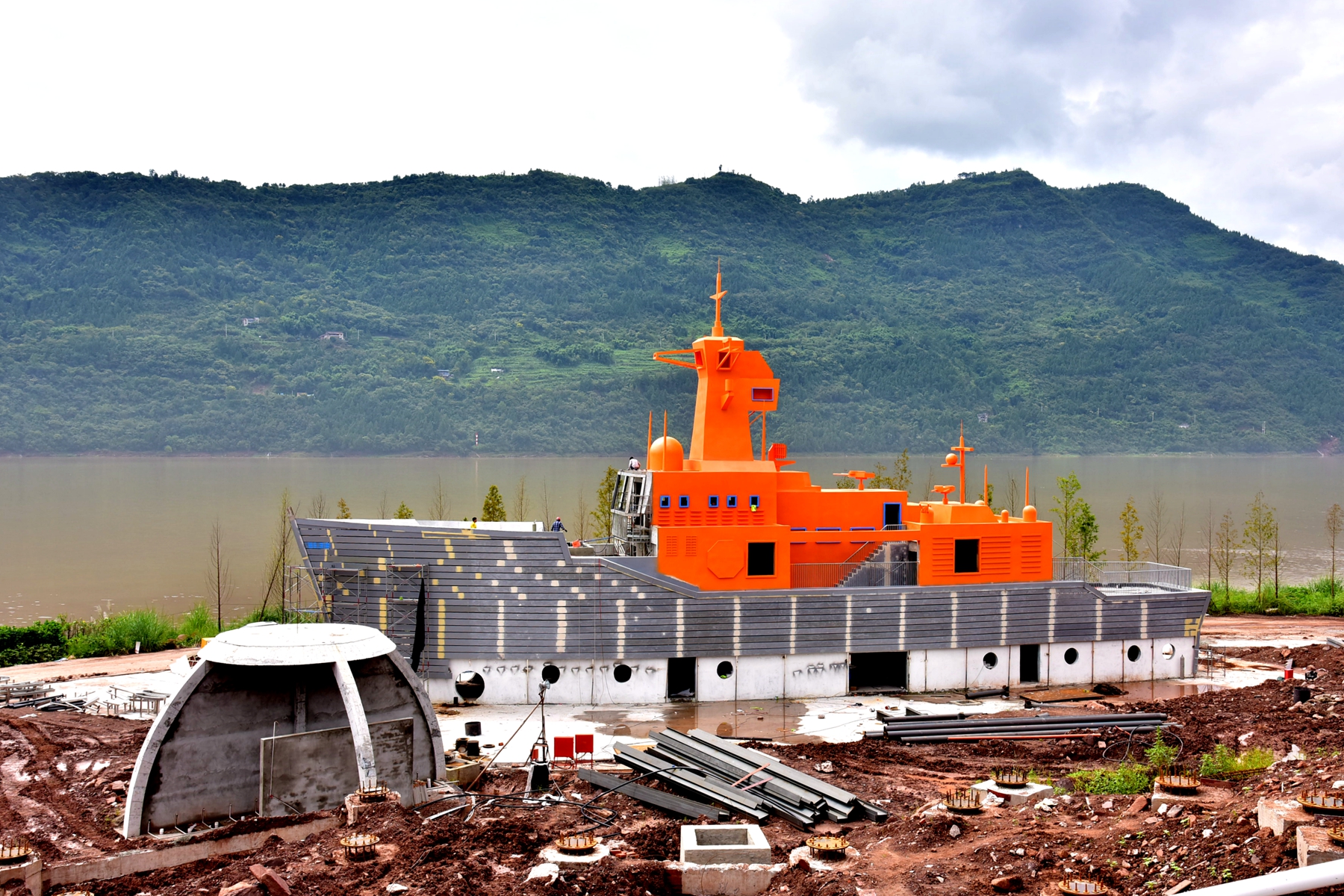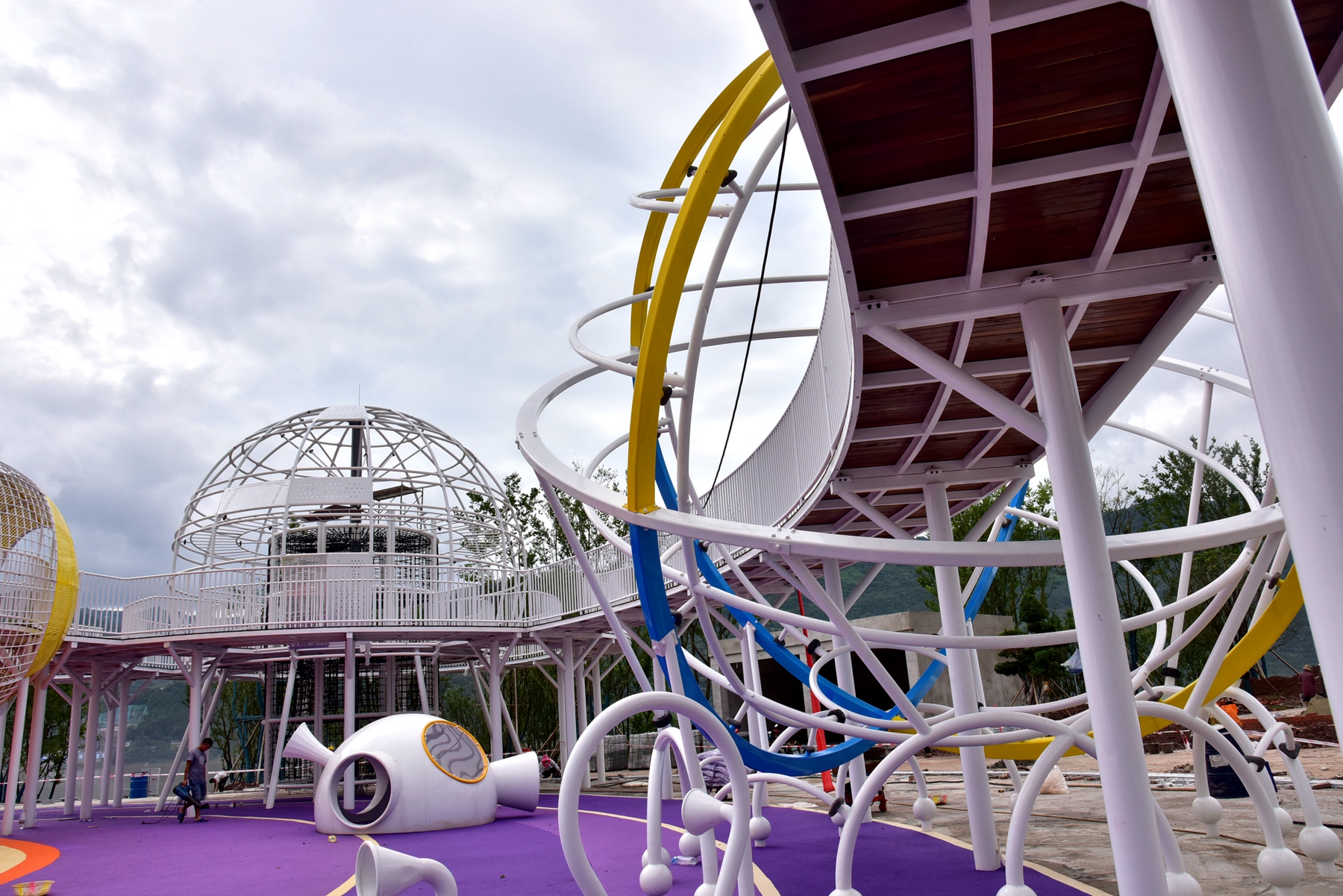 沿著環(huán)湖綠道,經(jīng)過月光草坪,彩云陽光兒童游樂園正在抓緊施工中。據(jù)了解,彩云陽光兒童游樂園是環(huán)湖綠道的節(jié)點之一,占地10余萬平方米。公園整體布局以海、陸、空為主題,其中“海洋”主題中一艘按照2:1比例還原的南海戰(zhàn)艦(云陽艦)停靠在江邊,威風(fēng)凜凜,令人印象深刻。這艘戰(zhàn)艦包含兒童游樂設(shè)施以及科普平臺,集游玩、學(xué)習(xí)科普為一體,適應(yīng)不同學(xué)齡兒童的游樂需求。而“星空”主題里,則巧妙分布著地球、月亮等不同星球形狀的攀登、滑行游樂設(shè)備,不僅好玩更好看。此外,在“陸地”主題中,還有重慶軌道交通集團(tuán)捐贈的輕軌車頭及三節(jié)車廂精彩亮相。