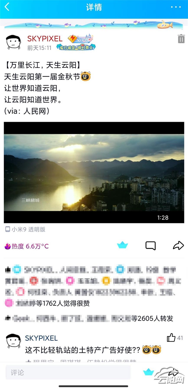 為了更好地” 讓世界知道云陽(yáng),讓云陽(yáng)知道世界”,9月23日,一名在外求學(xué)的云陽(yáng)籍學(xué)子,發(fā)布了一條附有文字和視頻的說說,短短兩三天時(shí)間,瞬間引爆了他原本安靜的QQ空間,獲得了 1762次點(diǎn)贊、2605次 轉(zhuǎn)發(fā)、6.6萬(wàn)次瀏覽。
