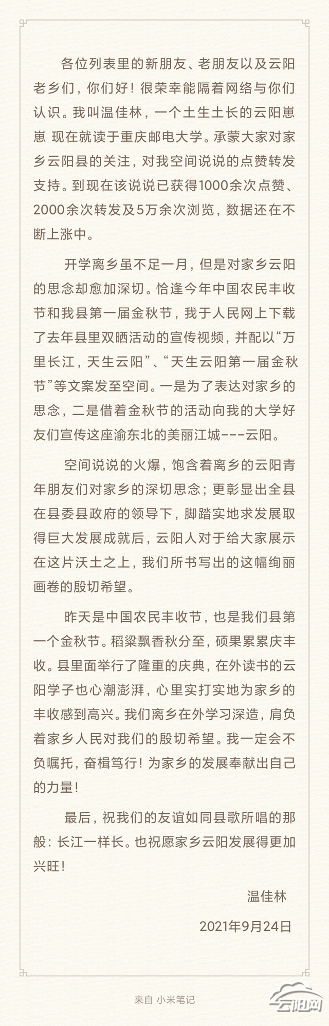 “縣里面舉行了隆重的慶典,在外讀書的云陽(yáng)學(xué)子也心潮澎湃,心里實(shí)打?qū)嵉貫榧亦l(xiāng)的豐收感到高興……”9月24日,溫佳林專門寫了一篇文章,既感謝大家的認(rèn)可,又抒發(fā)了自己對(duì)家鄉(xiāng)的熱愛以及為家鄉(xiāng)取得的巨大成就和變化而無比驕傲自豪。