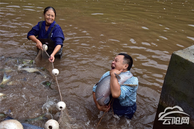 “這個(gè)大青魚(yú)有十多公斤喲,我抱都抱不??!”深秋時(shí)節(jié),在高陽(yáng)鎮(zhèn)青樹(shù)村的水塘里,云陽(yáng)縣漁公農(nóng)業(yè)開(kāi)發(fā)有限公司總經(jīng)理溫定軍和村民正一起熱火朝天地網(wǎng)魚(yú),網(wǎng)收緊后,肥美的大青魚(yú)、草魚(yú)、翹殼魚(yú)不停翻騰躍跳,引起水花四濺,溫定軍開(kāi)心地抱起一條大青魚(yú)向記者展示。