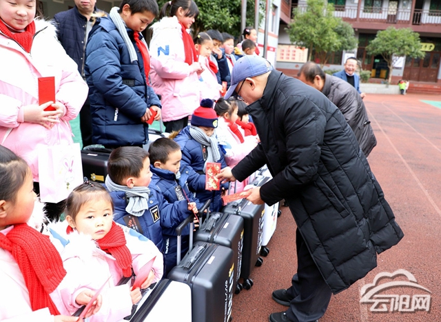 當(dāng)天上午,重慶市政協(xié)常委、民盟萬州區(qū)委會(huì)主委徐素環(huán),民盟區(qū)委會(huì)專職副主委、秘書長向家祜,民盟區(qū)委會(huì)社會(huì)服務(wù)部主任、重慶立信會(huì)計(jì)事務(wù)所負(fù)責(zé)人謝發(fā)勇一行 10人,迎著凌冽的寒風(fēng)來到了該校操場,將帶著溫暖的“愛心包”送到了孩子們手中。一個(gè)個(gè)拉桿箱、一件件羽絨服、一套套文具套裝、一條條圍巾、一袋袋奶糖……給寒冷的冬日增添了許多歡樂的氣氛和幸福的色彩。