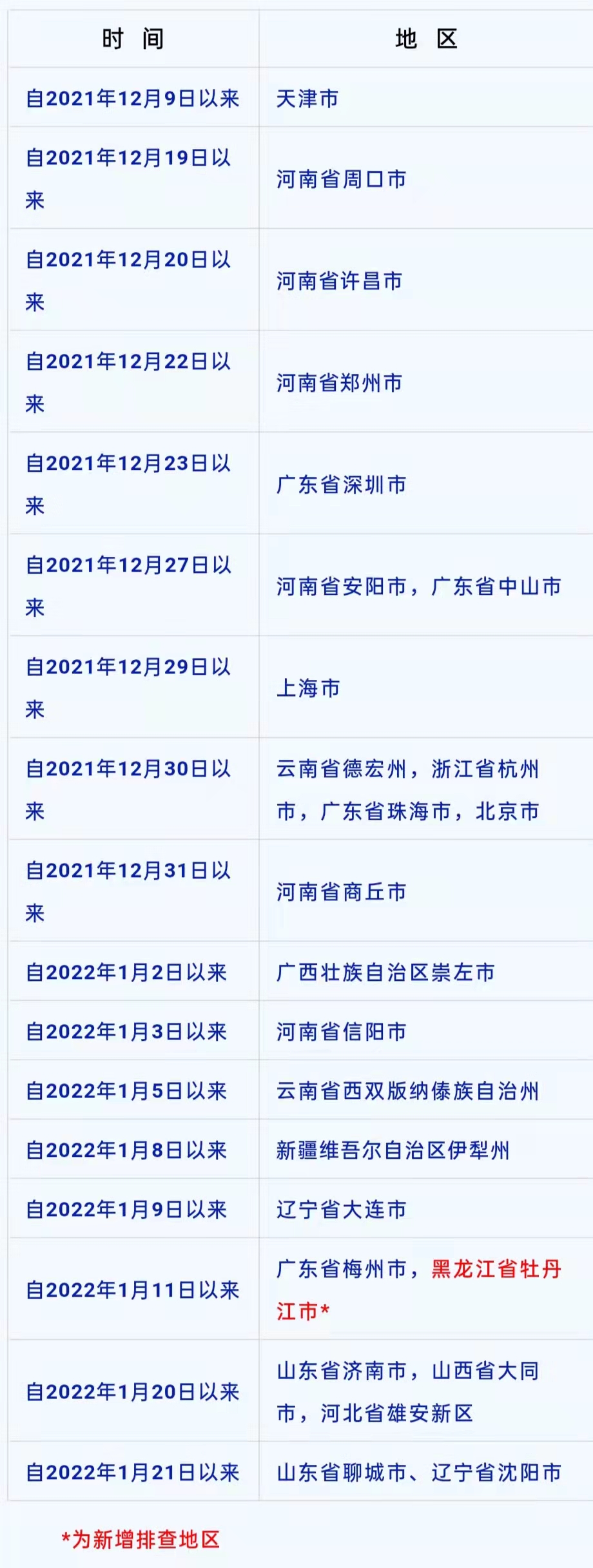 請有以下時段和地區(qū)旅居史的來渝返渝人員,在做好個人防護的前提下,及時向所在地社區(qū)(村)、所在單位報告,按要求配合做好核酸檢測、健康監(jiān)測等各項防控措施。
