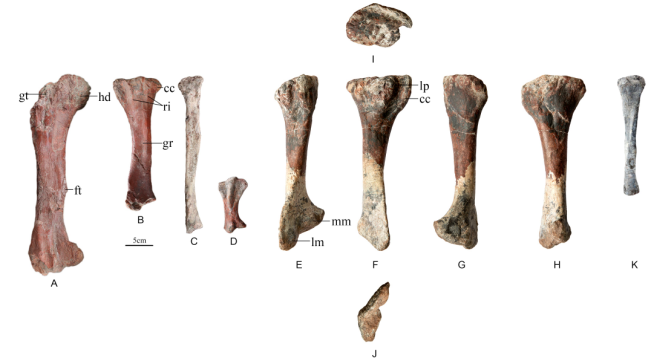 代輝介紹,元始巴山龍化石材料來自云陽恐龍動物群已發(fā)掘形成的沙溪廟組下段原址化石墻,包括肩胛骨、烏喙骨、背椎、尾椎、股骨、脛骨、腓骨、蹠骨、劍板、尾刺等部位的骨骼化石。