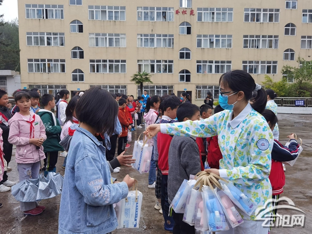 宣講結(jié)束后,該院醫(yī)護人員還給全校150余名師生每人一份防疫套餐包,大家一起進(jìn)行了合影留念。