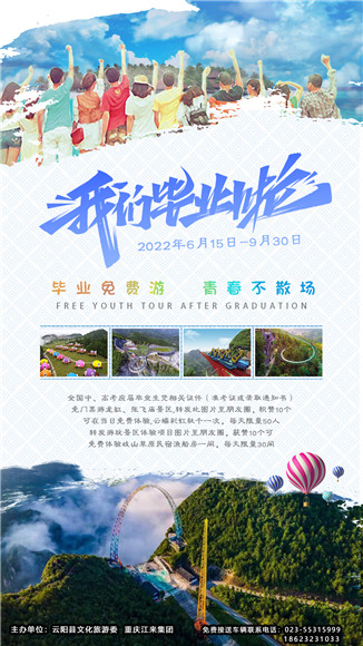 5.全國(guó)中、高考應(yīng)屆畢業(yè)生憑相關(guān)證件(準(zhǔn)考證或錄取通知書(shū))免門(mén)票游龍缸、張飛廟景區(qū)、轉(zhuǎn)發(fā)此圖至朋友圈,集贊10個(gè)科在當(dāng)日免費(fèi)體驗(yàn)云端彩虹秋千一次,每天限量50人,轉(zhuǎn)發(fā)游玩景區(qū)體驗(yàn)項(xiàng)目圖片至朋友圈,集贊10個(gè)可免費(fèi)體驗(yàn)歧山草原民宿漁船房一間,每天限量30間。