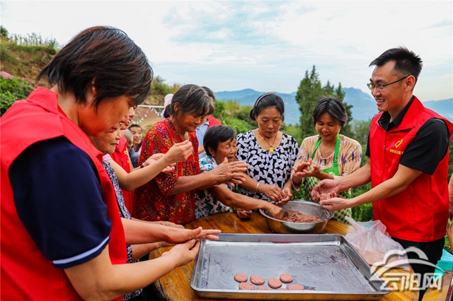 手工制作高粱月餅,數(shù)高粱粒歡樂競賽……當(dāng)日下午,來自人和街道桃園社區(qū)、云陽秋實農(nóng)業(yè)有限公司組成的志愿者們和當(dāng)?shù)氐目粘怖先藗円黄鹑嗝?、搓團(tuán)、制作高粱月餅,大家一邊忙著手頭的活,一邊聊聊家長里短,每個人的臉上都洋溢著溫暖的笑容。