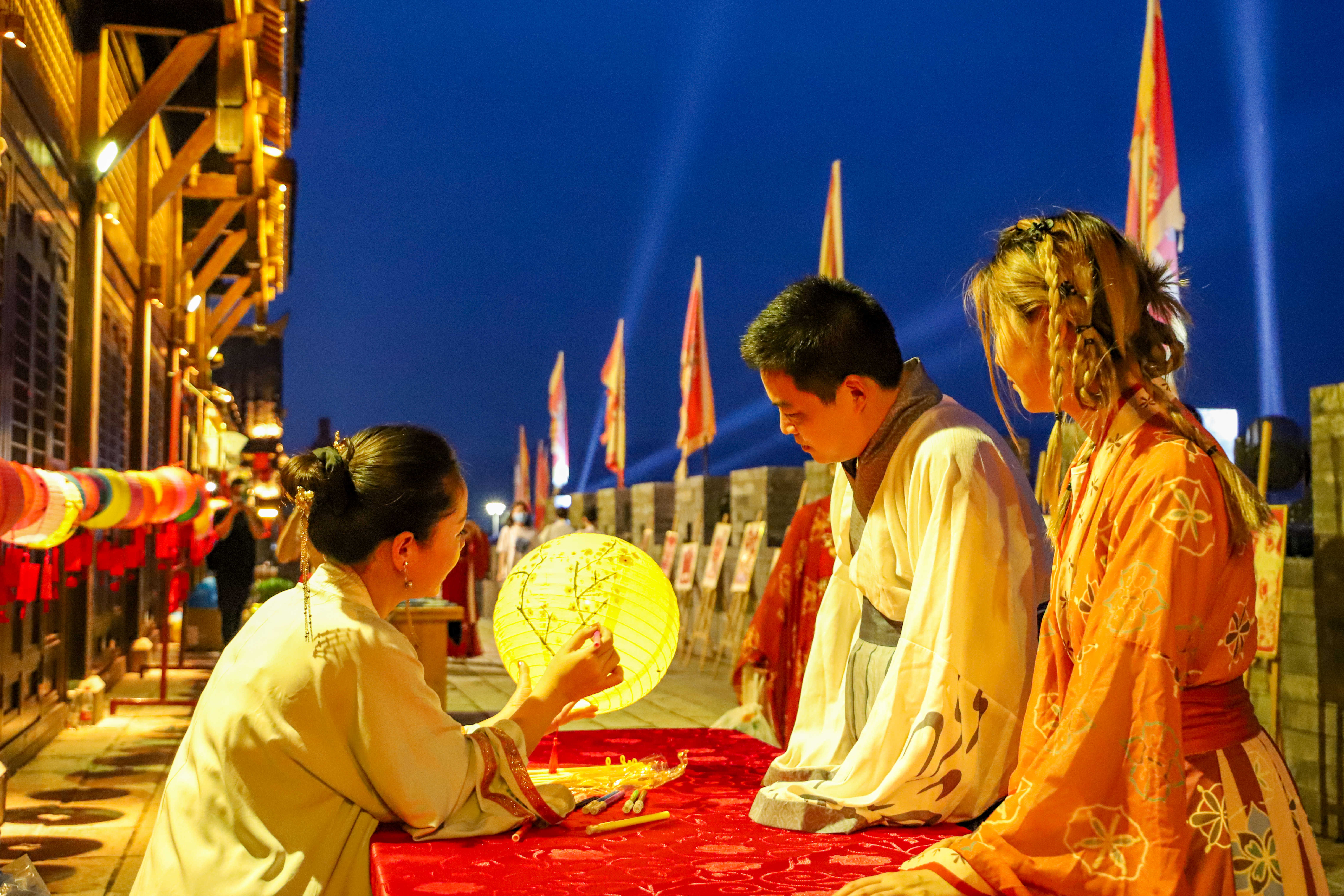 除了贈(zèng)送書(shū)畫(huà)作品,在三國(guó)印巷城樓下還設(shè)置了三處極富中秋元素的打卡點(diǎn),供市民游客拍照留戀。此外,還有志愿者現(xiàn)場(chǎng)手把手教市民制作燈籠、賀卡、剪紙等傳統(tǒng)手工品。