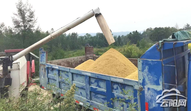 收割機忙碌地穿梭著,隨著轟隆隆的機械聲響起,飽滿的、沉甸甸的稻穗被卷進機械中,干凈的谷粒通過收割機的出糧口自動裝入轉(zhuǎn)運車。