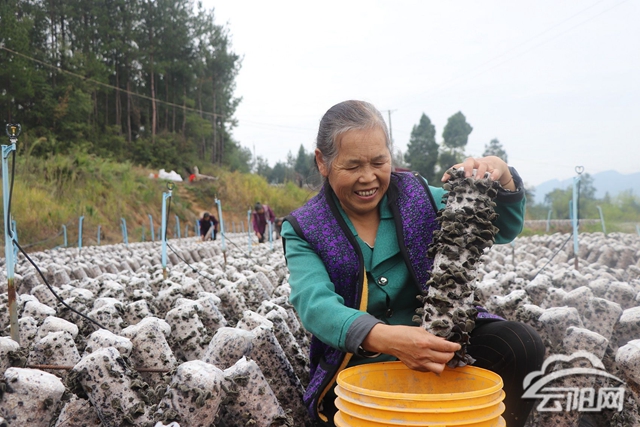 云陽網(wǎng)訊(通訊員 李小琴 黃舟)10月13日,筆者走進(jìn)云陽縣昱達(dá)農(nóng)業(yè)發(fā)展公司黑木耳生產(chǎn)基地,只見一排排大棚在陽光下熠熠生輝,一個(gè)個(gè)菌棒排列整齊,菌棒上成熟的黑木耳紛紛探出頭來,密密麻麻,晶瑩剔透,碩肥的黑木耳像一朵朵盛開的黑牡丹,20余名工人們正忙著有序采摘黑木耳。不遠(yuǎn)處,還有10余名工人在香菇大棚里喜摘香菇。