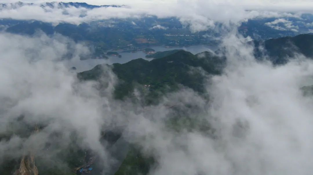霧氣繚繞的青山絕壁與碧波相映增輝