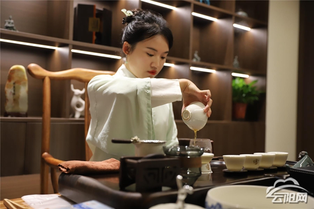 在云曦閣茶業(yè)店里,茶藝師們身著不同樣式的華服,手握竹制茶筅,快速地擊拂杯中茶湯,茶湯顏色漸濃,沫浡漸出……頓時,現(xiàn)場茶香四溢。她們的一顰一笑,展示了溫柔婉約、優(yōu)雅端莊的婀娜形態(tài)和古色古香的韻味,將千年華夏服飾風韻演繹得淋漓盡致,營造出清幽雅境的品茶氛圍。云曦閣茶業(yè)店長謝萍介紹:“我們將華服和茶文化相結(jié)合,給顧客一種新的視覺享受,讓顧客更深入地了解中國的傳統(tǒng)文化?!?/p>