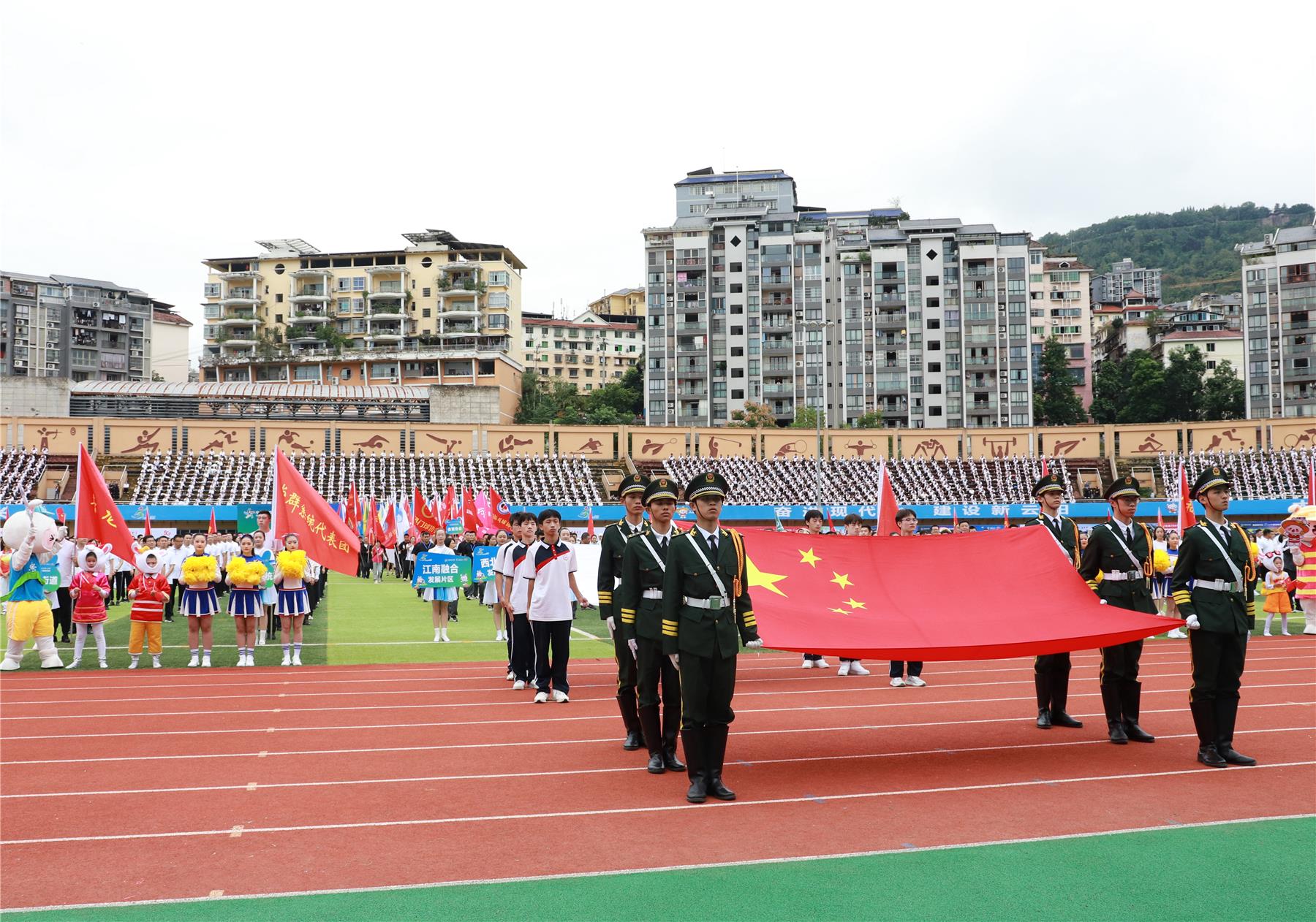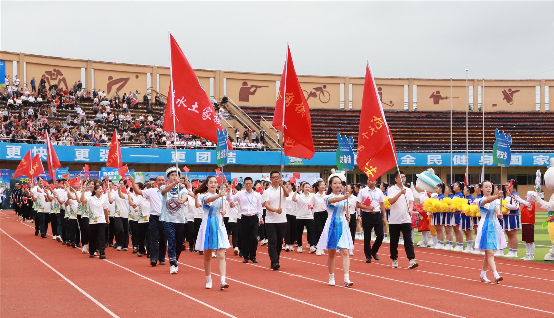 伴隨著昂揚的旋律,國旗手高擎國旗,步伐鏗鏘,護衛(wèi)著五星紅旗昂首闊步邁入會場。隨后,會旗方隊、裁判員方隊、“一心”方陣、“兩極”方陣、“西北協(xié)同發(fā)展片”方陣、“東北綠色發(fā)展片”方陣、“江南融合發(fā)展片”方陣、系統(tǒng)代表方隊、學校代表方隊、體育協(xié)會方隊陸續(xù)入場接受檢閱。