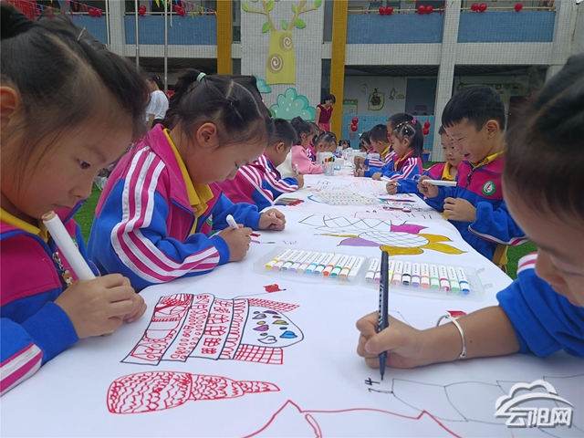 活動當天,幼兒園舉行了升旗儀式,伴隨著《義勇軍進行曲》故幼全體師生隊列整齊,行注目禮,小朋友們稚嫩的眼神中全是對祖國媽媽濃濃的愛意與敬意。為表達敬愛之情,孩子們?yōu)樽鎳I上了愛國詩歌朗誦《少年中國說》、《歌唱祖國》紅歌大合唱、“童心向黨,喜迎國慶”百米畫卷,孩子們手握畫筆在百米長卷上揮灑潑墨,埋頭作畫,畫出的是一幅幅色彩斑斕、童趣盎然的圖畫,傾注的是孩子們對祖國媽媽無盡的愛意。