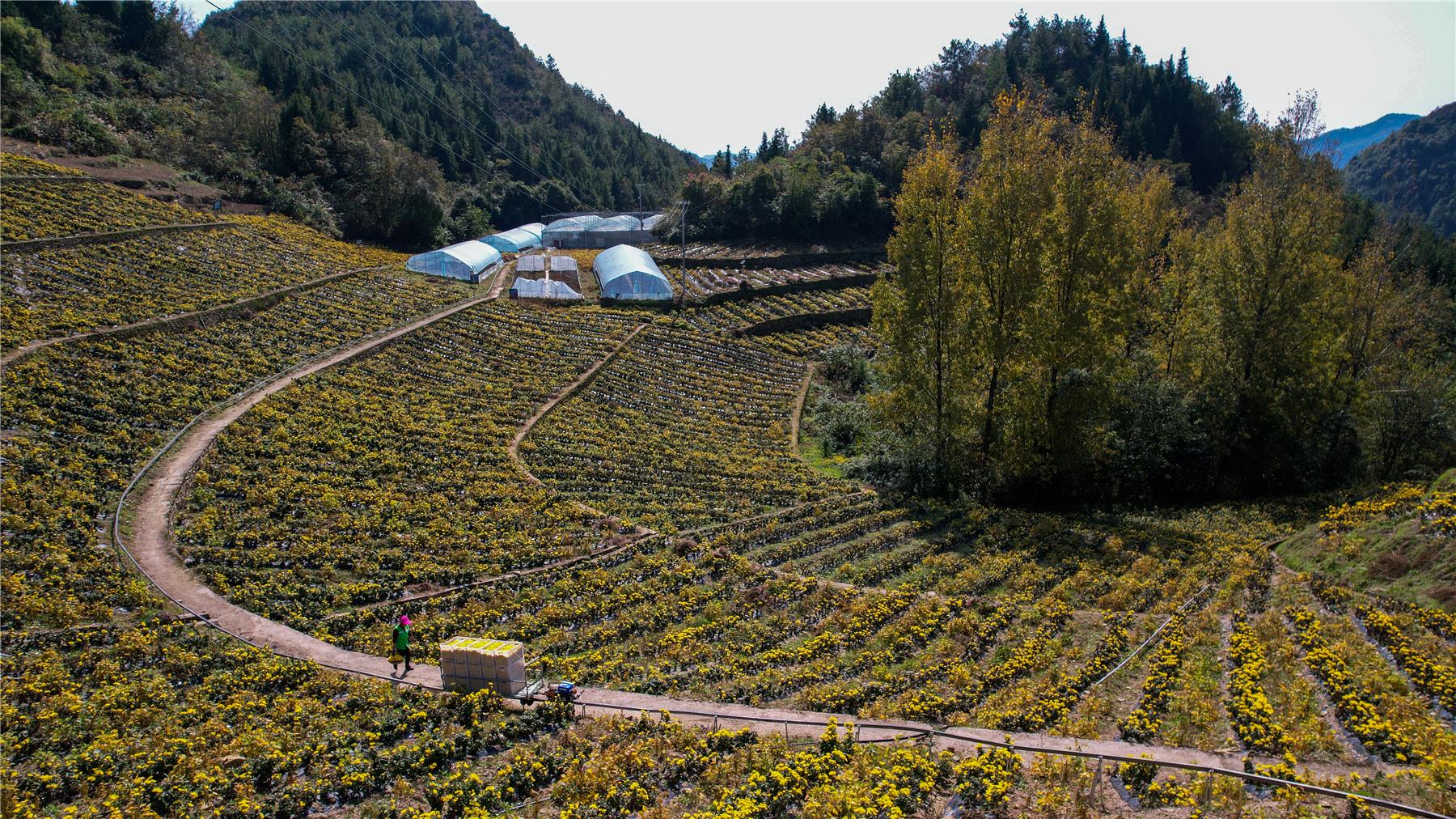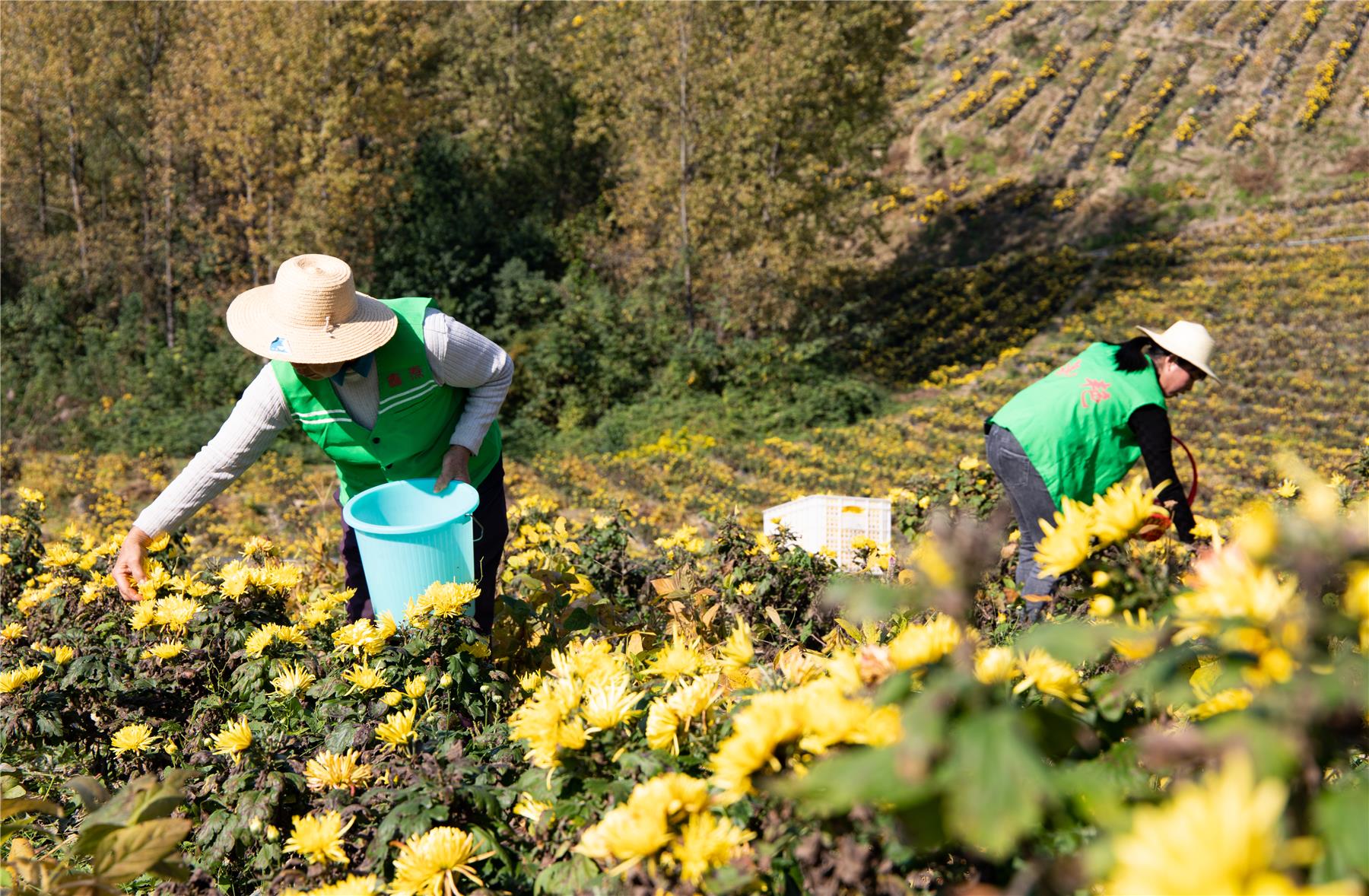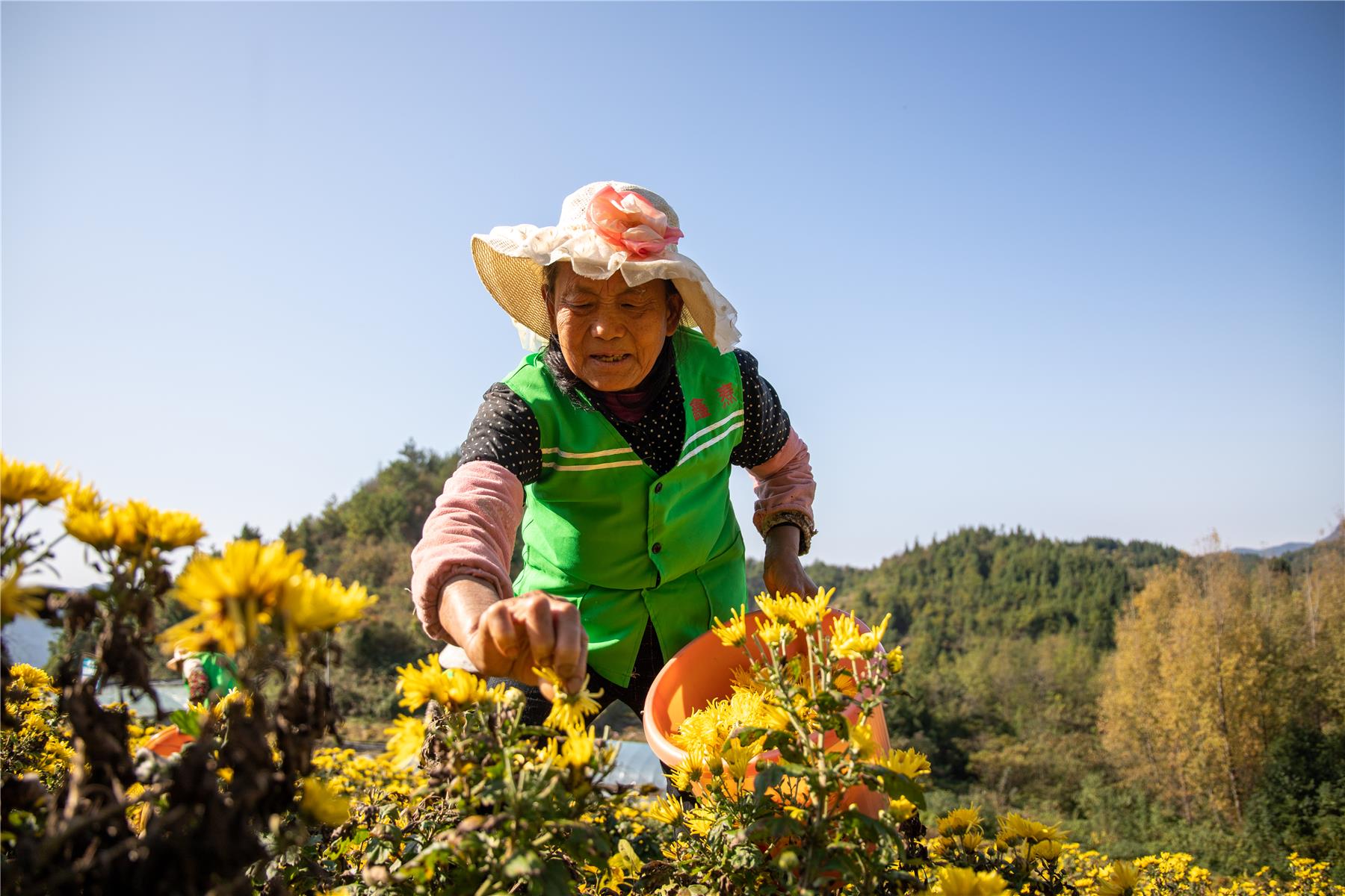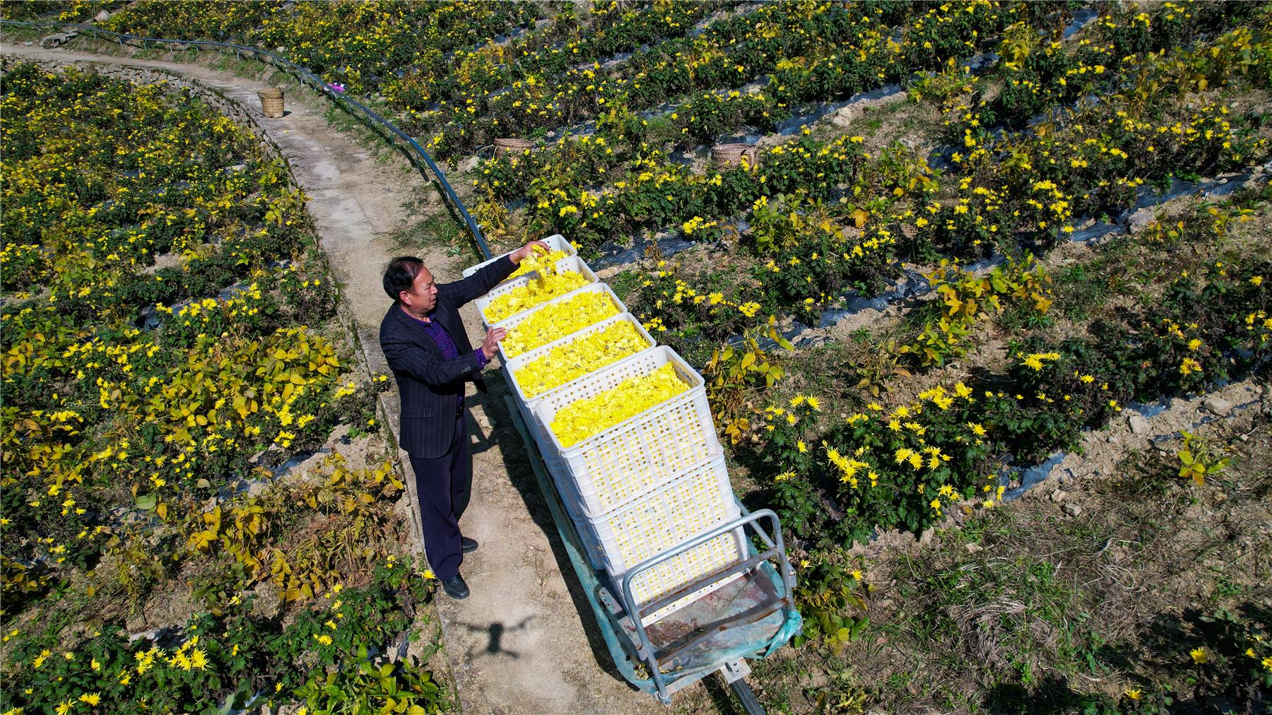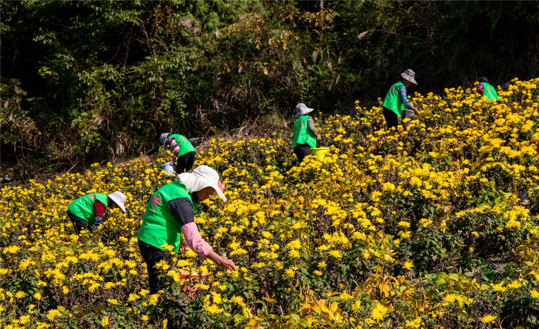 在云陽(yáng)縣堰坪鎮(zhèn)高新村菊花種植基地,放眼望去,一壟壟、一行行、一朵朵的金絲皇菊競(jìng)相綻放,滿地金黃,朵朵菊花迎風(fēng)而立,清香四溢,村民們穿梭其中,正忙著采摘綻放的菊花,呈現(xiàn)出一片豐收景象。云陽(yáng)縣鑫燾菊花種植股份合作社負(fù)責(zé)人冉秀清告訴記者,今年的氣候不錯(cuò),菊花長(zhǎng)勢(shì)良好。她帶動(dòng)農(nóng)戶種植了一萬(wàn)五千多畝菊花,能夠采摘菊花兩百多噸,能賣到三千多萬(wàn)元。