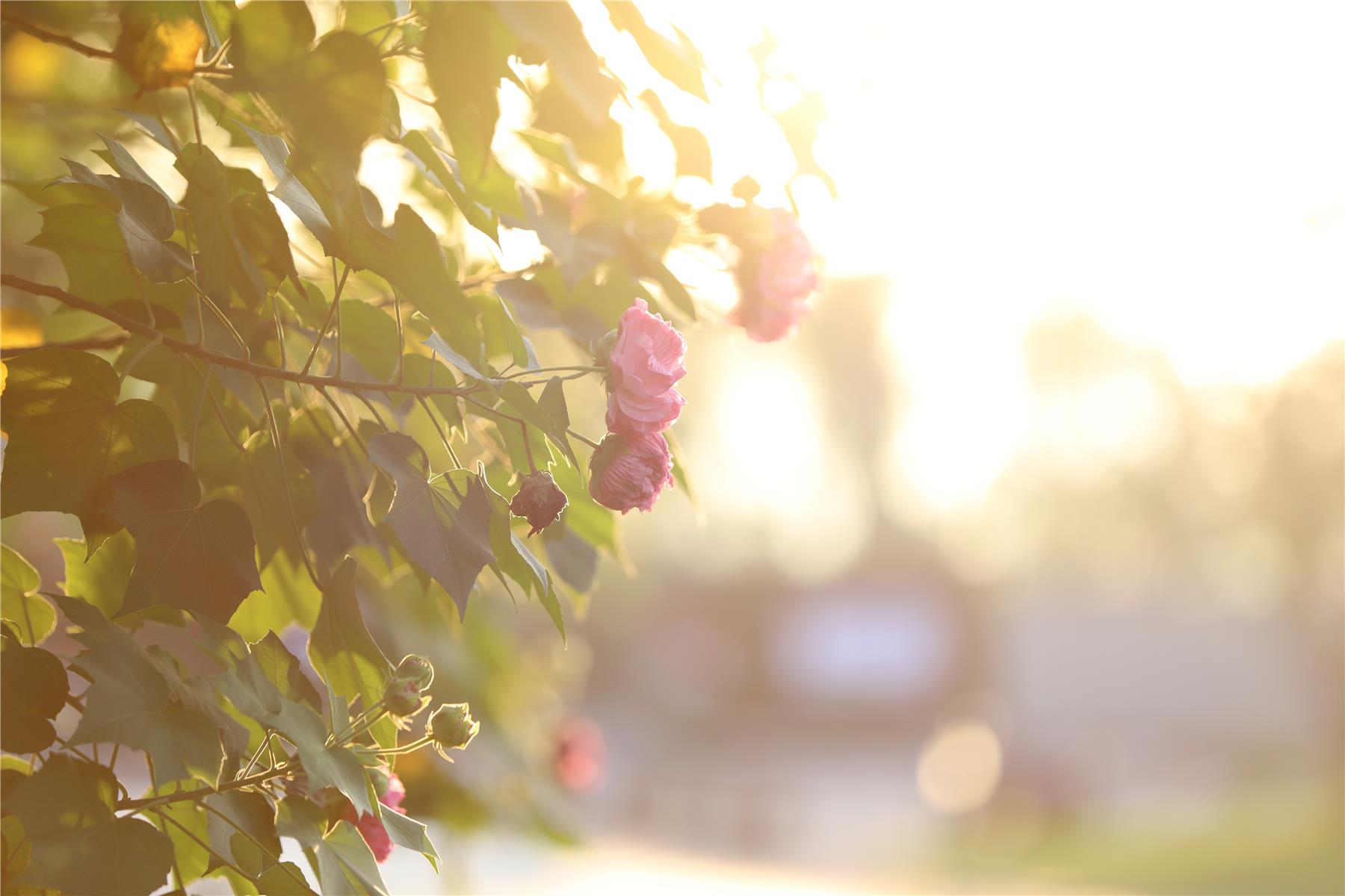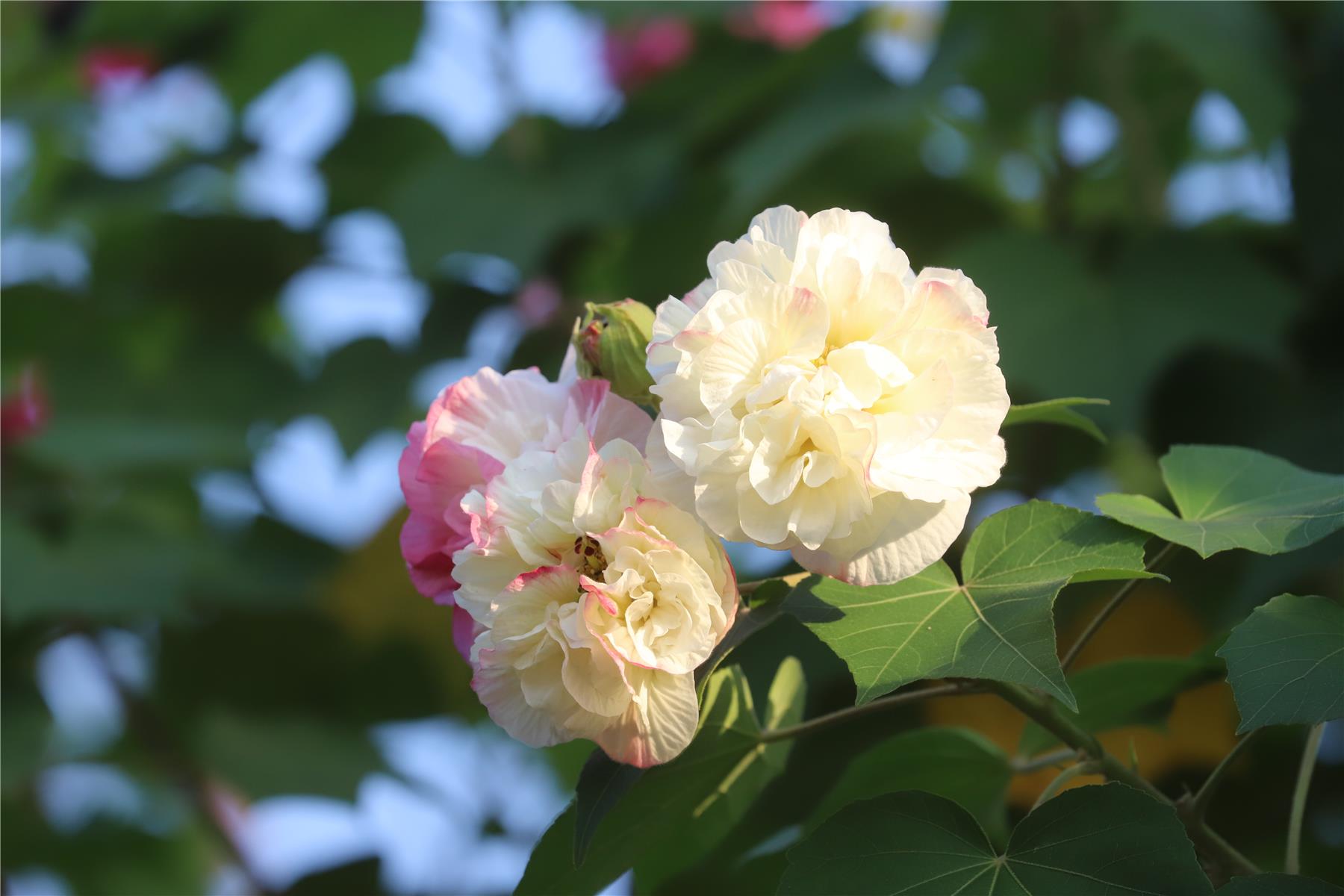 芙蓉花白如雪,粉似霞,紅白相間,宛如雪后之彩霞,花色鮮艷,姿容秀麗,展現(xiàn)深秋的風(fēng)情。微風(fēng)拂動,紅花綠葉相襯,更顯清新淡雅。在夕陽的映襯下,粉白的花瓣上鋪展著閃閃金光,雍容華貴之姿不輸牡丹,逆光之下,花瓣的脈絡(luò)清晰可見。芙蓉盛開,吸引了不少市民駐足欣賞,他們或贊嘆其美麗,或欣賞其姿態(tài),或贊嘆其芬芳。